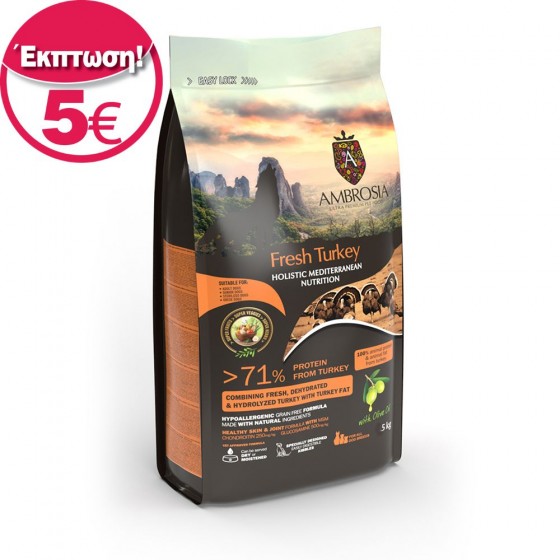 [value] => Η συνταγή μας Ambrosia Fresh Turkey συνδυάζει τα οφέλη της υψηλής ποιότητας και ταυτόχρονα χαμηλής περιεκτικότητας σε λιπαρά πρωτεΐνης που προέρχεται από φρέσκα φιλέτα γαλοπούλας. Με σχεδόν τη σωστή ποσότητα ελαιολάδου και ένα μείγμα μεσογειακών φρούτων και βοτάνων, προσφέρουμε μια υποαλλεργική τροφή για σκύλους, μεσογειακού τύπου, χωρίς δημητριακά, γεμάτη αντιοξειδωτικά, κατάλληλη για όλες τις ράτσες σκύλων.