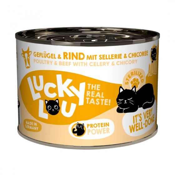 [value] => Lucky Lou Can LifeStage Adult Sterilized Πουλερικά & Βοδινό (με Σέλινο & Κιχώριο) 200gr