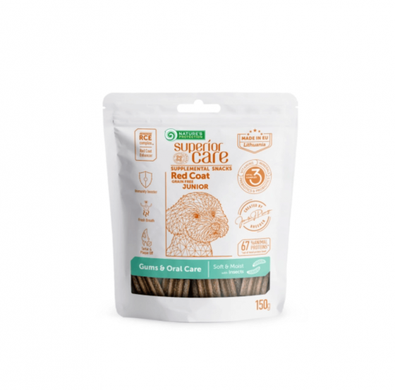 Τα Nature's Protection Superior Care Red Coat Grain Free Gums & Oral Care συμπληρωματικά σνακ, ιδανικά για τη συνολική ευεξία και τη στοματική φροντίδα του κατοικίδιου ζώου. Η κύρια πηγή πρωτεΐνης στα συμπληρωματικά σνακ είναι τα έντομα. Είναι μια εξαιρετικά βιώσιμη πηγή πρωτεΐνης, καθώς απαιτούν λιγότερη γη, νερό και τροφή από τα παραδοσιακά ζώα εκτροφής και μια καλή πηγή πρωτεΐνης υψηλής ποιότητας, καθώς και απαραίτητων αμινοξέων, βιταμινών και μετάλλων. Η επεξεργασμένη πρωτεΐνη εντόμων θεωρείται υποαλλεργική, γεγονός που την καθιστά καλή επιλογή για σκύλους με τροφικές ευαισθησίες ή αλλεργίες. Αυτά τα λειτουργικά σνακ - συμπληρώματα έχουν πιο υγρή και απαλή υφή από τις συνηθισμένες λιχουδιές. Τα πιο υγρά προϊόντα αποκαλύπτουν ένα πιο φυσικό άρωμα, καθιστώντας τα αγαπημένα ακόμη και για τα πιο απαιτητικά κατοικίδια. Τα συμπληρωματικά σνακ είναι εμπλουτισμένα με κλινοπτιλόλιθο ηφαιστειακής προέλευσης από τη φύση - MicroZeoGen. Βοηθά στην απομάκρυνση των τοξινών από το σώμα του κατοικίδιου ζώου και όταν αποτοξινωθεί, τα αποτελεσματικά θρεπτικά συστατικά, οι βιταμίνες και τα μέταλλα απορροφώνται εύκολα από το σώμα. Η μοναδική τεχνολογία παραγωγής και το ορυκτό πολυφωσφορικό νάτριο που περιέχονται στις λιχουδιές έχουν αντιβακτηριακές ιδιότητες που μπορούν να βοηθήσουν στη μείωση του αριθμού των βακτηρίων, μειώνοντας έτσι τη δυσάρεστη οσμή στο στόμα του σκύλου. Τα συμπληρωματικά σνακ δεν περιέχουν συστατικά σιτηρών, καλαμποκιού ή προϊόντων σόγιας που μπορούν να προκαλέσουν αλλεργικές αντιδράσεις.