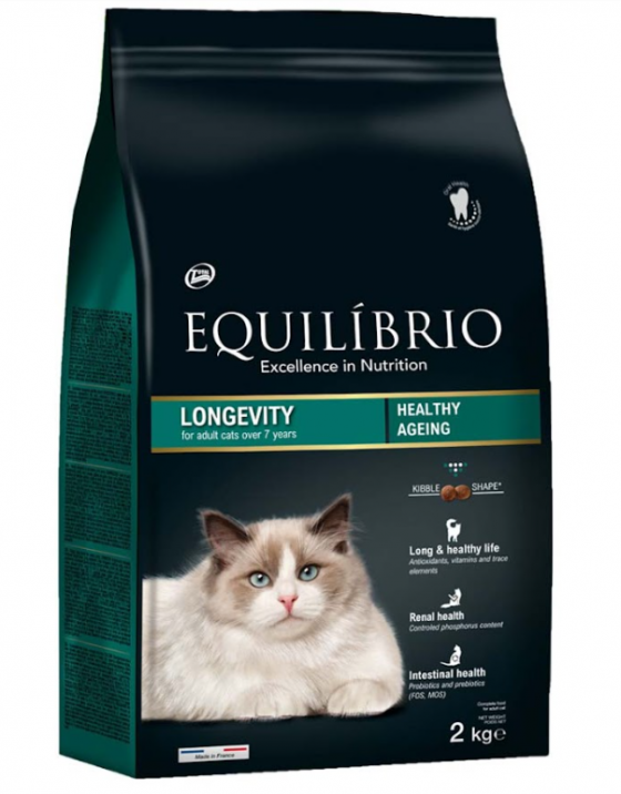 Η Equilibrio Longevity, περιέχει φυσικά αντιοξειδωτικά, τα όποια ενισχύουν την φυσική άμυνα του οργανισμού και συμβάλλουν θετικά στη μακροβιότητα. H ειδική σύνθεση της τροφής, βοηθά στη διάσπαση του λίπους μέσω της δράσης της L-καρνιτίνης και των ινών που περιέχει. Συμβάλλει στη καλή λειτουργία των νεφρών και της καρδιάς, ενώ παράλληλα ελέγχει το pH στο ουροποιητικό σύστημα, για τη διατήρηση της σωστής λειτουργίας του. Το ειδικό σχήμα της κροκέτας, αποτρέπει το σχηματισμό της οδοντικής πέτρας. Είναι ειδικά σχεδιασμένη, για γάτες, που δεν εμφανίζουν έντονη δραστηριότητα και ζουν κυρίως εντός σπιτιού.